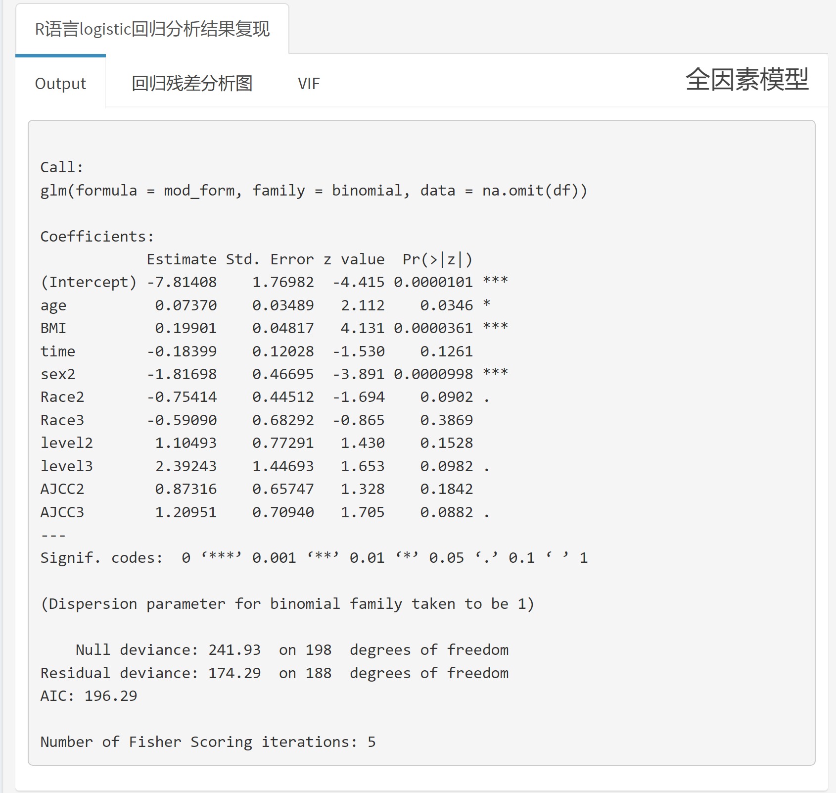 有全因素模型和逐步回归法模型,本案例未进行逐步回归,因此仅展示全因素模型。