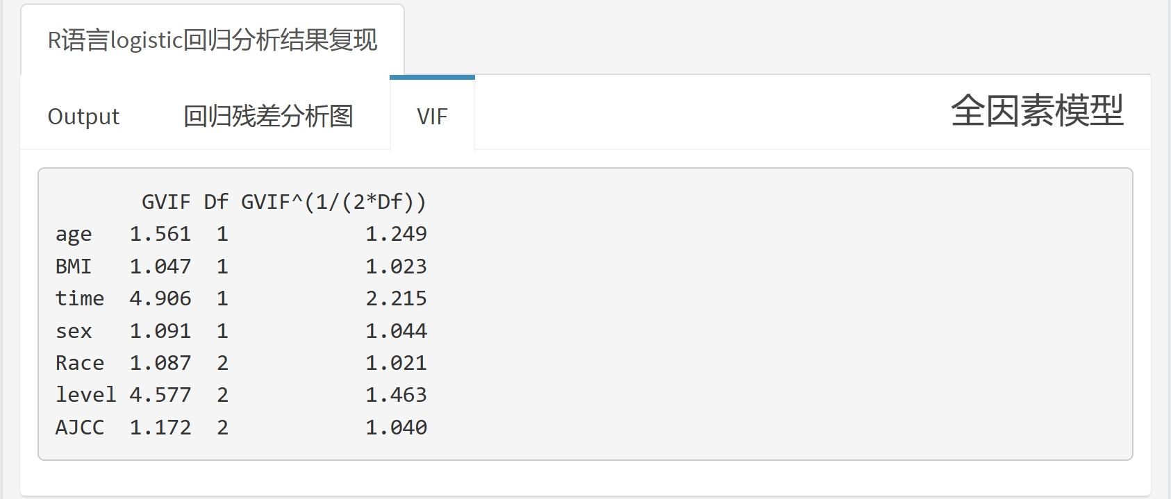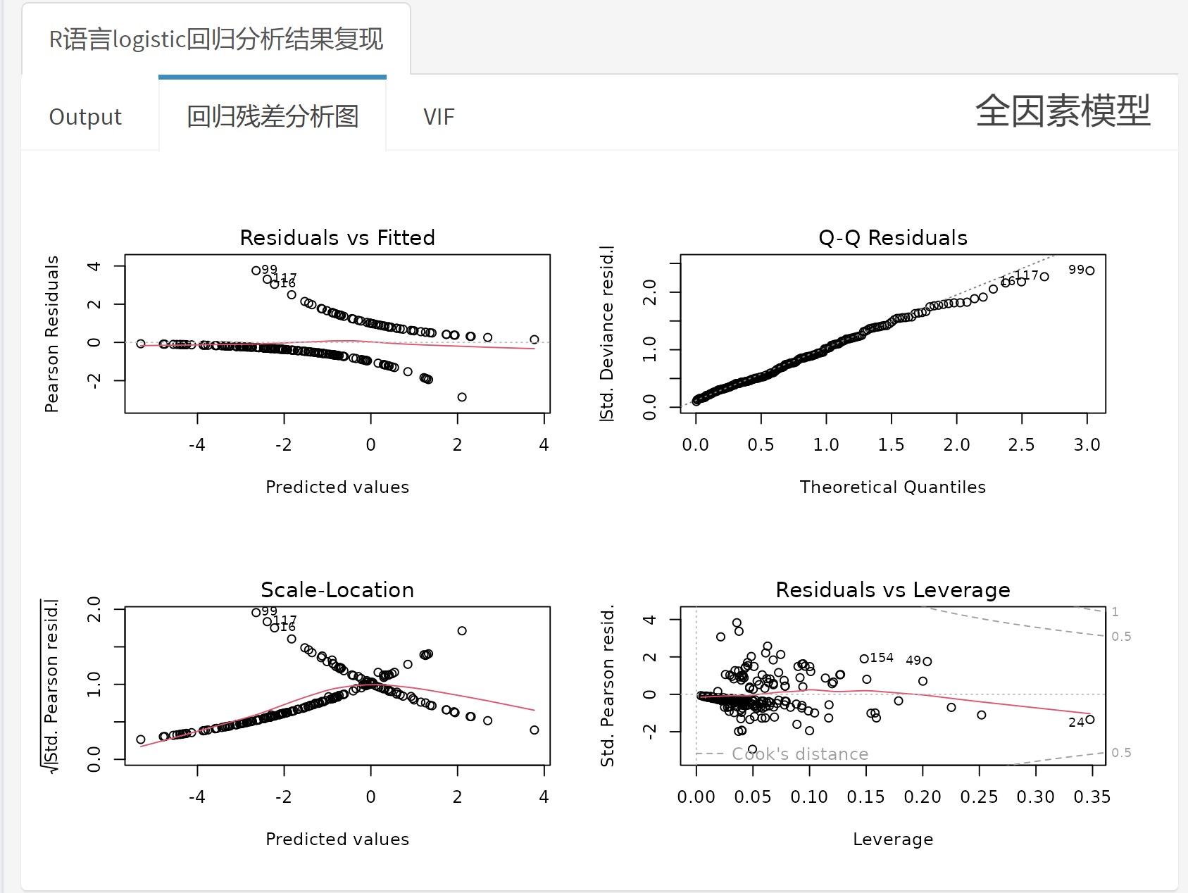 目前风暴统计还会给出R语言输出结果,回归残差分析图,方差膨胀因子(VIF)。