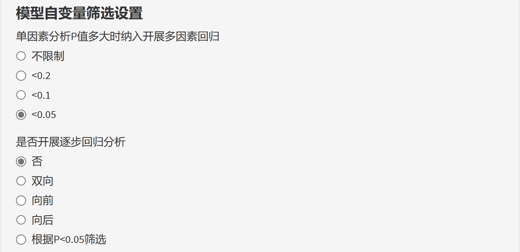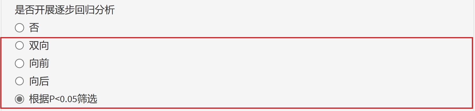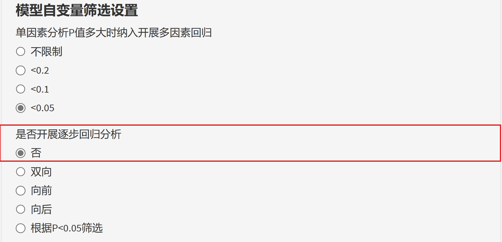 根据研究需要,如果需要开展先单后多的自变量筛选方式,那么“是否开展逐步回归分析”选择”否”。