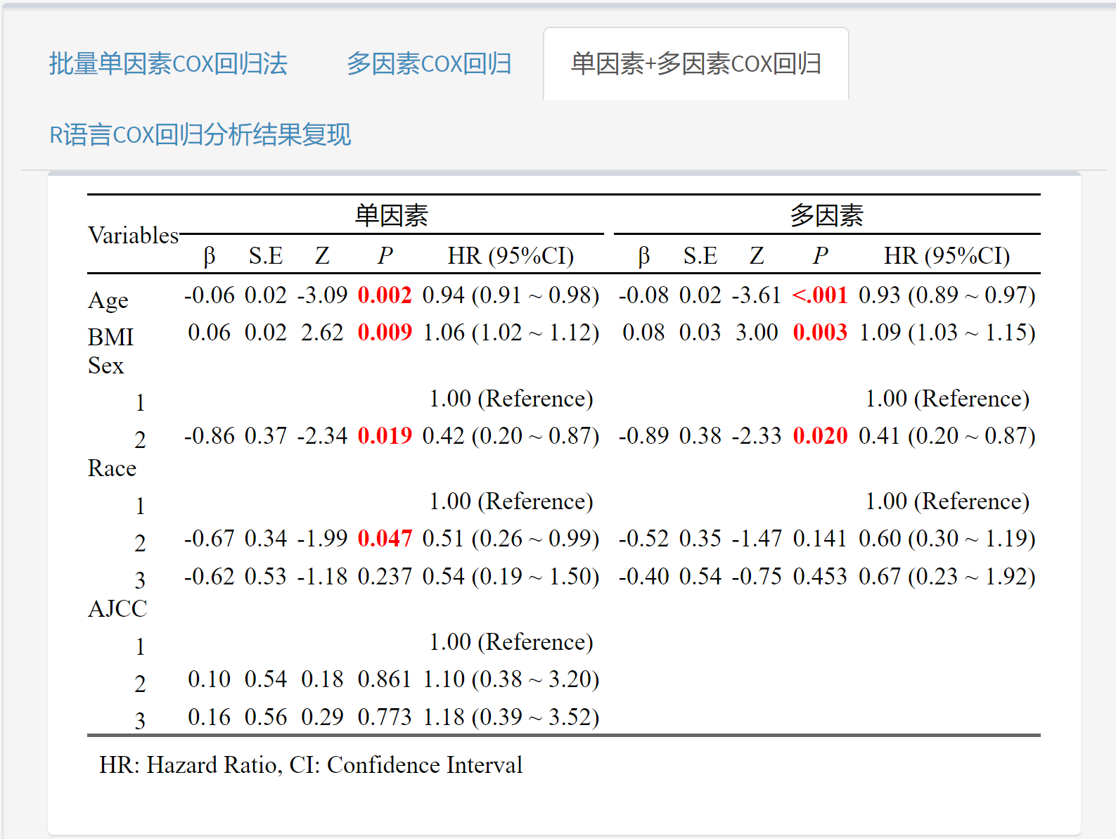 平台给出了多种结果展示,仅展示单因素回归结果,仅展示多因素回归结果,单因素+多因素显示在同一个表格中!