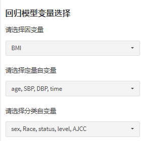 首先,选入变量,包括因变量、定量自变量、分类自变量