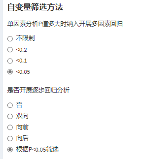 其次,选择自变量的筛选方式,包括P阈值,回归方法。