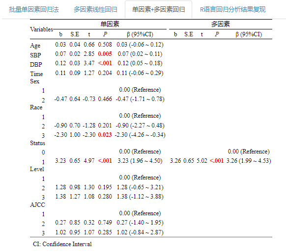 注:先单后多与逐步回归是两种不同的自变量筛选方式,先单后多主要根据单因素P阈值进行筛选;逐步回归则是通过变量的逐个纳入与剔除,以AIC值最小作为最优模型选择准则。因此有些变量P值大于预设的阈值但仍保留在逐步回归模型中也是正常的哦,想要避免这种情况的发生,可以选择”根据P<0.05筛选”的逐步回归!