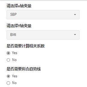 进入“相关分析与散点图”模块后,仅需要选入x轴变量,y轴变量,以及是否要在图中显示相关系数与拟合趋势线!