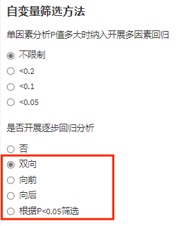回归方法有先单后多(选”否”),双向逐步回归,向前逐步回归,向后逐步回归,根据P<0.05筛选。